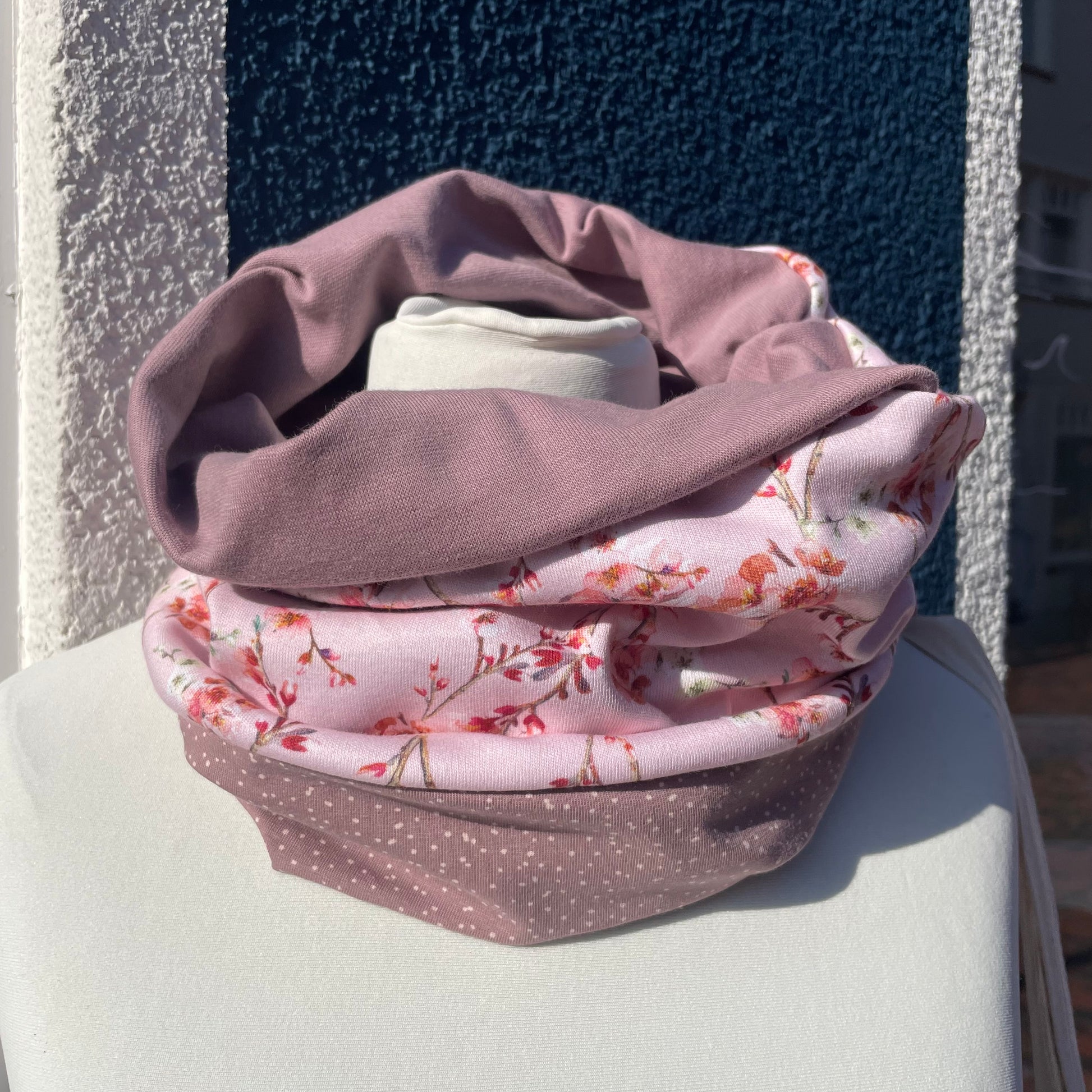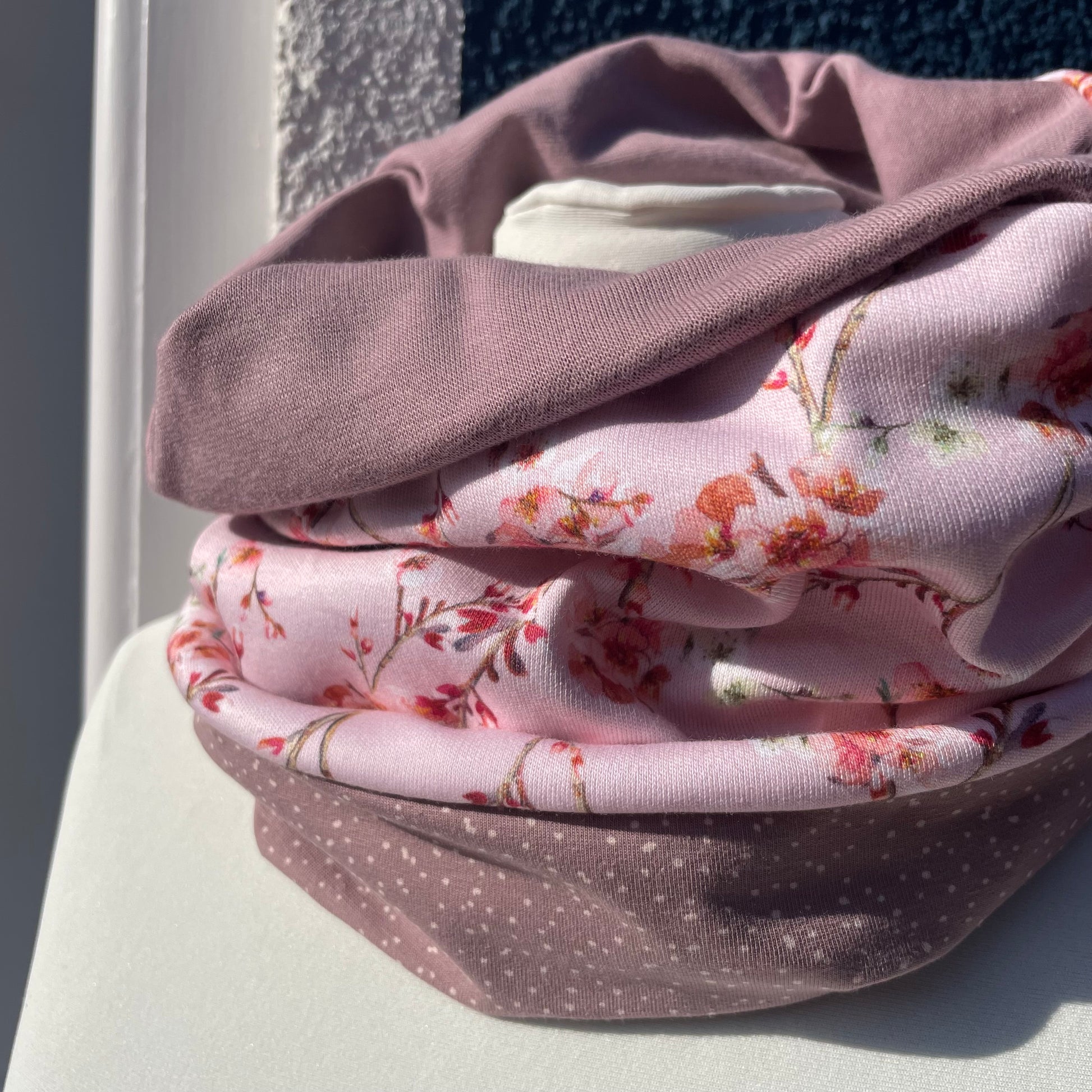 Unsere kuschelige Loopina im Mustermix. Ein farbenfrohes Muster im Balistyle trifft auf sandfarbenes Bündchenjersey und einen samtweichen Cordnicky in Altrose in höchster Biostoffqualität.