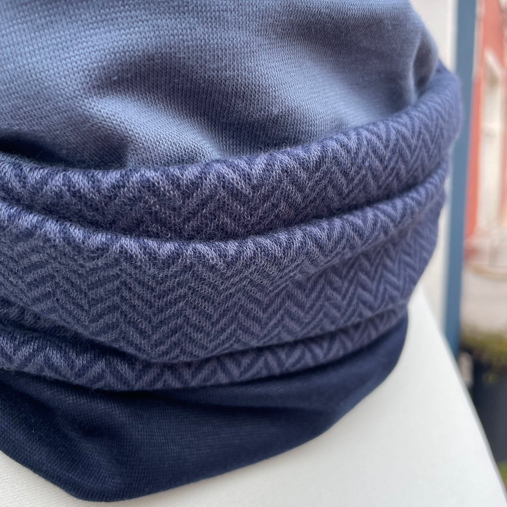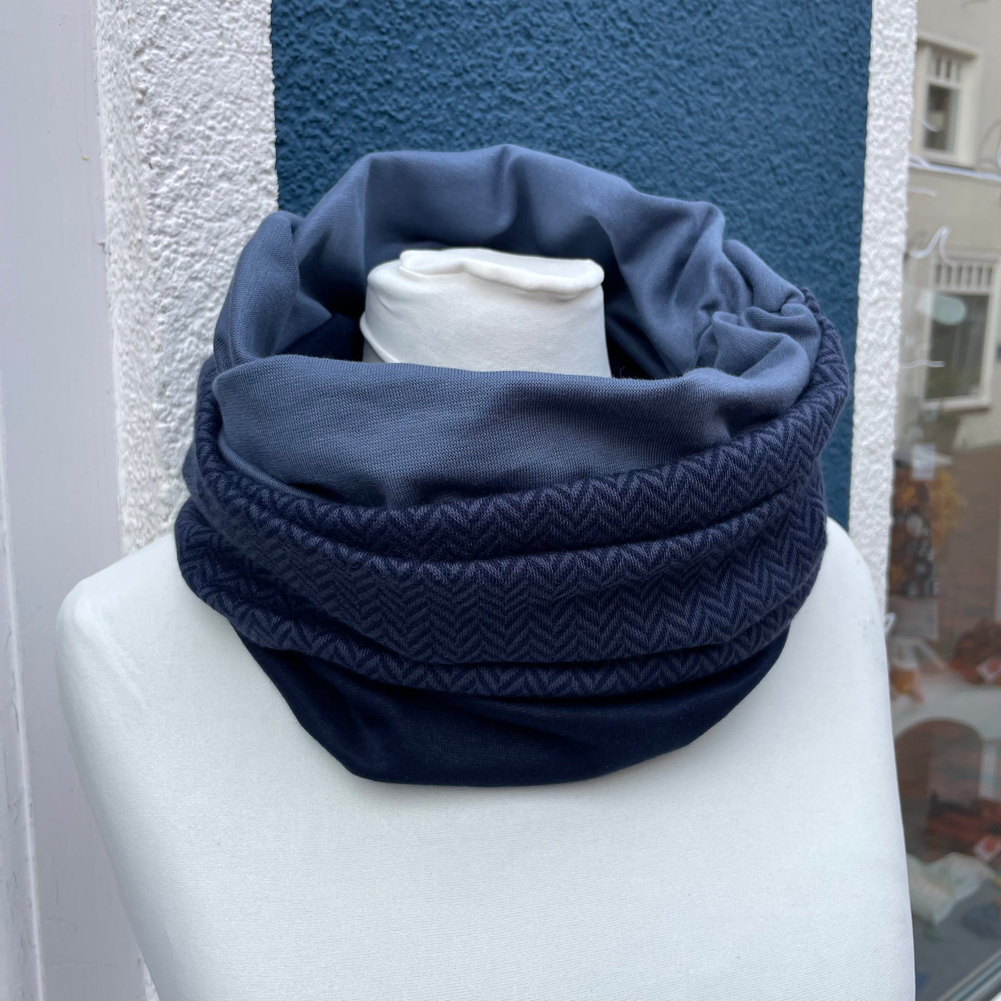 Die Looping wird einfach um den Hals gelegt und ist etwa 35 cm breit und 70 cm im Umfang.