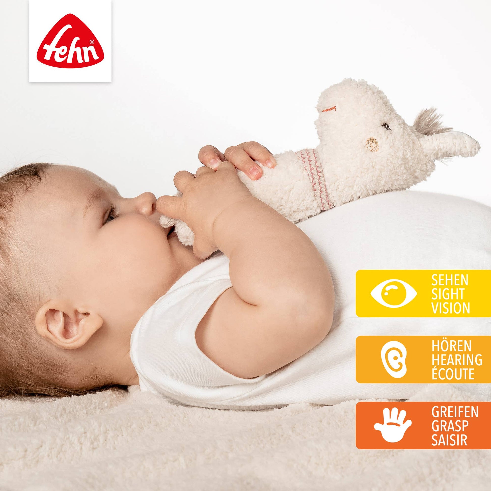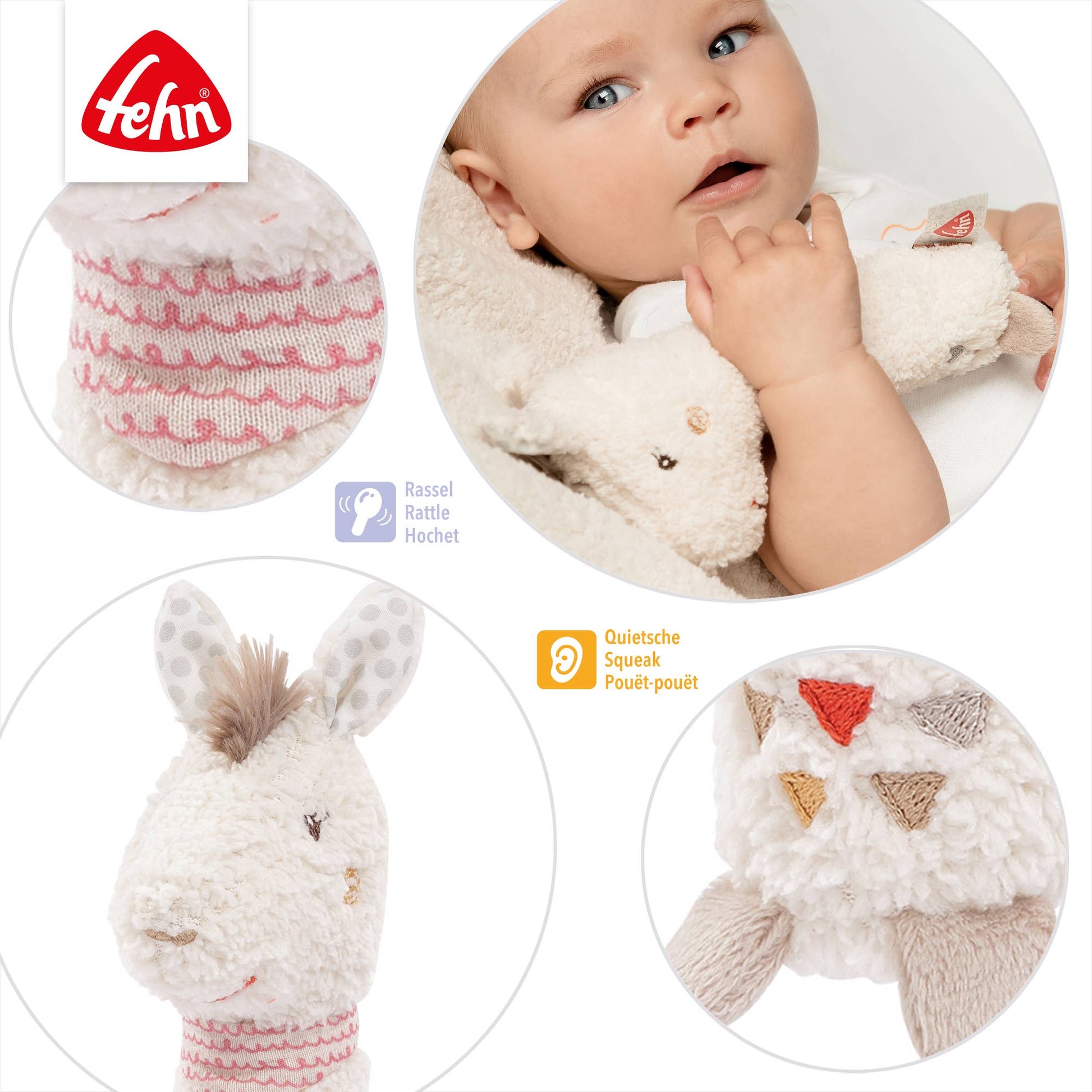 Fehn Stabgreifer lassen sich greifen, fühlen und quietschen und fördern damit das Interesse des Babys und laden zum Entdecken und Forschen ein. Die Stabquietschen fördern spielend den Hör-, Greif- und Tastsinn sowie die Feinmotorik des Babys und eignen sich somit ideal als Geschenke zur Geburt, Taufe oder zum Geburtstag.